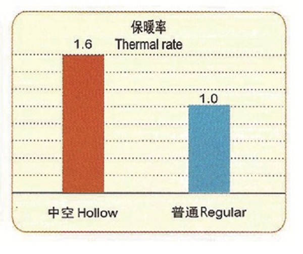 中空粘胶纤维的直径比同纤度的普通纤维直径粗,腔内含有大量静止空气,隔热保暖性能提高。空气的导热性要比各纤维的导热性低一半左右(空气的热导率0.026w/m·℃,各纤维织物热导率0.04~0.06 w/m·℃),故织物保暖性因素中的呆滞空气量是一个重要因素,高中空度纤维的呆滞空气量给织物带来了好的保暖性。曾测定热阻值,普通粘胶纤维为0.889,中空粘胶0.947(m2·℃/w)。