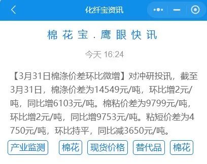 2022/4/13 12:30:003月29日——30日 晴纶价格行情:3月30日 部分化学纤维价格行情: 3月31日棉花价格行情: 数据来源:中国纤维网、化纤宝、对冲研投、隆众资讯、生意社等。