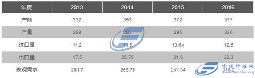 2016年我国粘胶短纤生产装置产能总量在377万吨,产量预估在336万吨,较2015年增量41万吨。2016年我国粘胶短纤累计进口量预估在12.5万吨,与2015年相比略有萎缩。2016年我国粘胶短纤累计出口量预计为32.3万吨,较2015年增量明显。