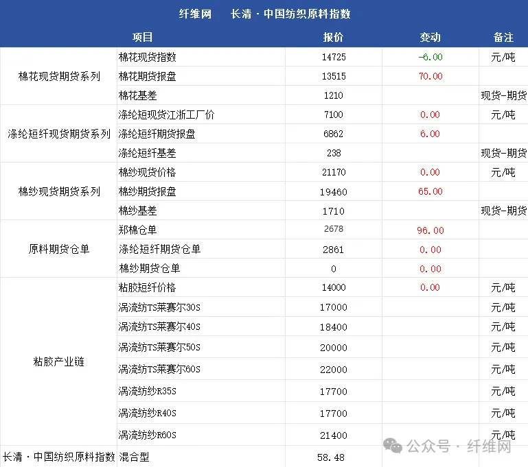 一、棉花现货指数系列 棉花现货指数 报价为 14725 元 / 吨。 较上一交易日下降 6.00 元 / 吨。 棉花现货期货系列 - 棉花期货报盘 报价为 13515 元 / 吨。 较上一交易日上升 70.00 元 / 吨。 棉基差 报价为 1210 元 / 吨。 备注为 “现货 - 期货”。 二、涤纶短纤现货系列 涤纶短现货浙江工厂价 报价为 7100 元 / 吨。 较上一交易日无变动(0.00 元 / 吨)。 涤纶短纤期货系列 - 涤纶短纤期货报盘 报价为 6862 元 / 吨。 较上一交易日上升 6.00 元 / 吨。 涤纶短纤基差 报价为 238 元 / 吨。 备注为 “现货 - 期货”。 三、棉纱现货价格 棉纱现货价格 报价为 21170 元 / 吨。 较上一交易日无变动(0.00 元 / 吨)。 棉纱现货期货系列 - 棉纱期货报盘 报价为 19460 元 / 吨。 较上一交易日上升 65.00 元 / 吨。 棉基差 报价为 1710 元 / 吨。 备注为 “现货 - 期货”。 四、郑棉仓单 郑棉仓单 报价为 2678 元 / 吨。 较上一交易日上升 96.00 元 / 吨。 涤纶短纤期货仓单 报价为 2861 元 / 吨。 较上一交易日无变动(0.00 元 / 吨)。 棉纱期货仓单 报价为 0 元 / 吨。 较上一交易日无变动(0.00 元 / 吨)。 六、粘胶短纤价格 粘胶短纤价格 报价为 14000 元 / 吨。 较上一交易日无变动(0.00 元 / 吨)。 涡流纺 TS 莱赛尔 30S 报价为 17000 元 / 吨。 涡流纺 TS 莱赛尔 40S 报价为 18400 元 / 吨。 涡流纺 TS 莱赛尔 50S 报价为 20000 元 / 吨。 涡流纺 TS 莱赛尔 60S 报价为 22000 元 / 吨。 涡流纺 R35S 报价为 17700 元 / 吨。 涡流纺 R40S 报价为 17700 元 / 吨。 涡流纺 R60S 报价为 21400 元 / 吨。 七、长清 - 中国纺织原料指数 - 混合型 长清 - 中国纺织原料指数 - 混合型 报价为 58.48。 总结 上涨项目 棉花期货报盘、棉纱期货报盘、郑棉仓单、涤纶短纤期货报盘等项目价格有所上涨。 下跌项目 棉花现货指数价格有所下跌。 无变动项目 涤纶短现货浙江工厂价、棉纱现货价格、粘胶短纤价格、涤纶短纤期货仓单、棉纱期货仓单等项目价格无变动。 总体来看,今日纺织原料市场有涨有跌,部分期货项目价格上涨较为明显,而现货指数略有下降。 免责声明:本文部分来源网络,知识产权属于原作者,仅用于行业交流,如有侵权,请联系小编,我们会在第一时间删除。五、原料期货仓单