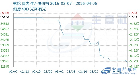 4月6日,40D氨纶主流报价在27000-34000元/吨左右。目前国内氨纶市场弱势难改,下游织造业开工恢复正常,市场需求增加,但在氨纶行业整体供应过剩局面下厂家出货难度不减,贸易商随行就市,暂无涨价预期。