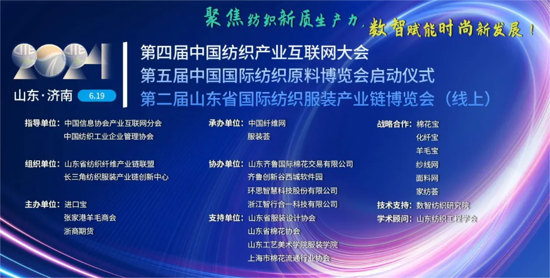 本次会议由中国信息协会产业互联网分会、中国纺织工业企业管理协会指导,由山东省纺织纤维产业链联盟、长三角纺织服装产业链创新中心组织,由进口宝、张家港羊毛商会、浙商期货主办,由中国纤维网、服装荟承办,山东齐鲁国际棉花交易有限公司、齐鲁创新谷西城软件园、环思智慧科技股份有限公司、浙江智行合一科技有限公司协办,山东省服装设计协会、山东省棉花协会、山东工艺美术学院服装学院、上海市棉花流通行业协会支持,棉花宝、化纤宝、羊毛宝、纱线网、面料网、家纺荟战略合作,数智纺织研究院技术支持,山东纺织工程学会学术支持。