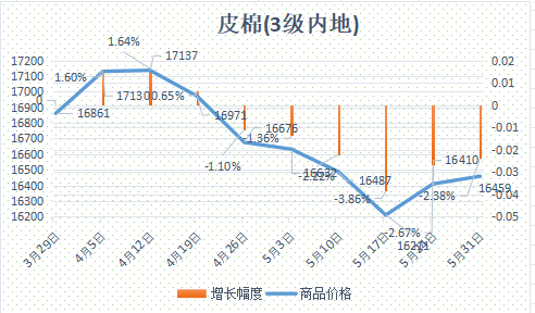 根据纤维网监测,现货皮棉328价格16459元/吨,较上周16410上涨49元/吨,涨幅0.30%。期货2024年9月合约则掉头向下,本周收盘价为15120,较上周15540下跌420,跌幅2.70%。