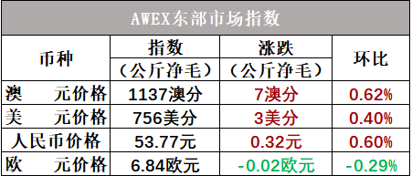 以澳元计价的EMI(东部市场价格指数)本周收于1137澳分/公斤(净重),环比上涨0.62%。