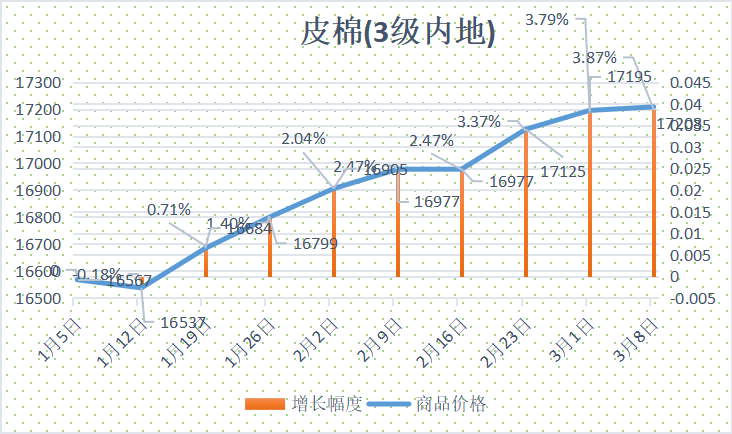 根据纤维网监测,现货皮棉328价格17208元/吨,较上周17195上涨13元/吨,涨幅0.08%。期货2024年5月合约上涨,本周收盘价为16200,较上周16150上涨50,涨幅0.31%。