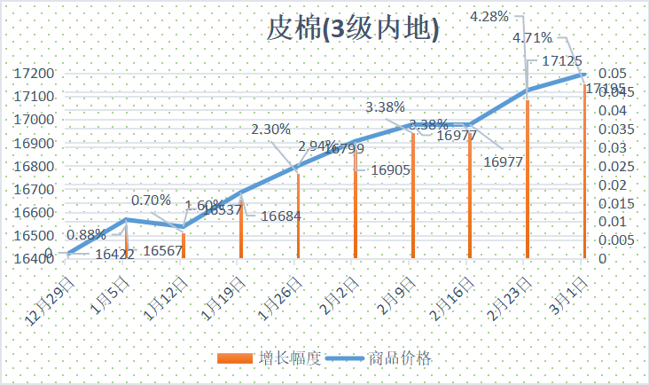 根据纤维网监测,现货皮棉328价格17195元/吨,较上周17125上涨70元/吨,涨幅0.41%。期货2024年5月合约下跌,本周收盘价为16150,较上周16320下跌170,跌幅1.04%。