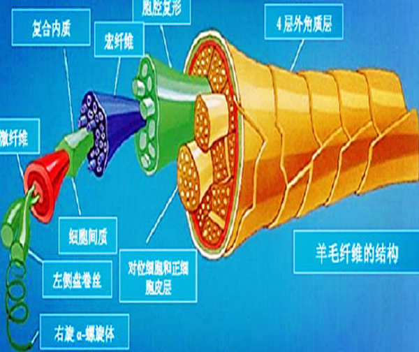 羊毛是由包覆在外部的鳞片层,组成羊毛实体的皮质层,和毛干中心不透明的髓质层三部分组成,髓质层只存在于粗羊毛中,细羊毛中没有。