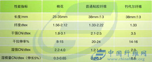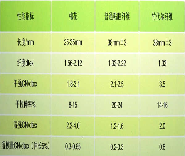 从表中可以看出,竹代尔纤维干湿伸长处于14-16之间,湿模量达到BISFA标准要求,这使得竹代尔纤维具有良好弹性的同时,还具有良好抗皱及抗形变能力,其湿强的提高大大促进了耐洗涤性和耐穿着性。