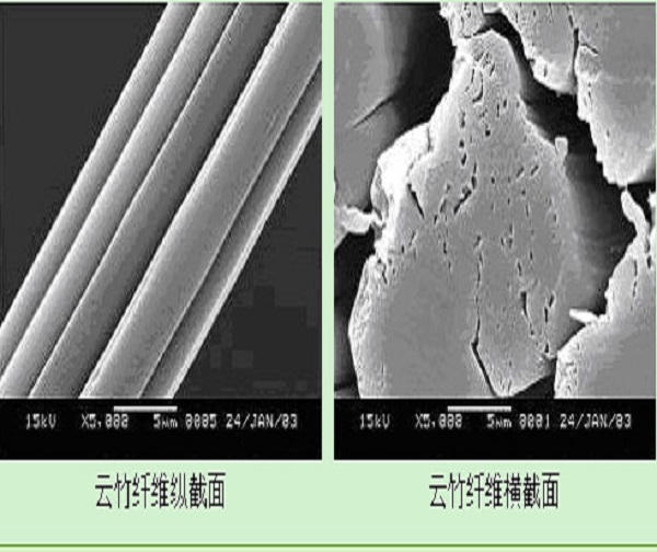 云竹纤维基本保持了竹子纤维的天然特性,其横截面布满了不规则的空隙,可以瞬间吸收并蒸发水份,具有极佳的透气、透湿的毛细管效应。