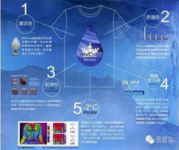 1、清涼感:WinCool纤维制品添加由吸热慢与散热快的复合材质,使穿着者有如置身于大自然冰泉中的清凉舒适感。