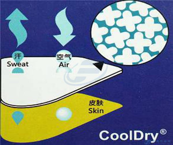 Cooldry综合了棉的舒适性和涤纶的快干性,将自然界的毛细管原理导入纺织品的开发,采用特殊设计的多沟槽纤维和独特的面料设计与后整理方法,能将肌肤表面的汗水和湿气瞬间吸干并快速传输至织物组织外层并散发,同时,高异形度的断面结构使其透气性,
