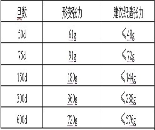 T80可以针织、机织,机织时最适宜采用斜纹组织,如采用平纹组织时,应避免使用一上一下结构,较疏松的组织结构有利于使T80的弹性得到充分的体现。T80织造时的张力控制在形变张力的0.8倍以下较适合,各规格T80的形变张力如下: