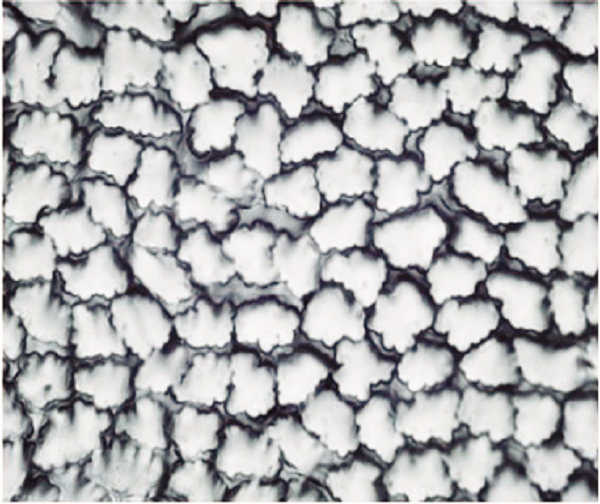 普通粘胶纤维的截面呈锯齿形皮芯结构,纵向平直有沟横。