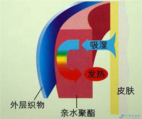 利用吸收人体皮肤呼吸产生的湿气来达到发热的效果。这种发热是一种能量的转换,从而使面料达到发热的效果。