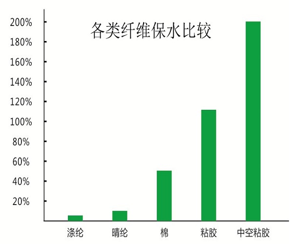 中空粘胶纤维的高中空度,使它具有高的保水性,保水率比普通粘胶纤维增加了40-70%,比棉花增加了80-110%。