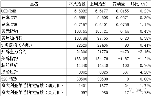 2025/4/11 10:36:57一、指数二、棉花: 根据中国纤维网监测,现货皮棉328价格19354元/吨,较上周20735下跌1381元/吨,跌幅6.66%。期货2022年9月合约大幅下跌,本周收盘价为17230,较上周19515下跌2285,跌幅11.71%。 本周棉花市场在美国的“恶法”正式实施、美联储加息及大宗商品下跌共…
