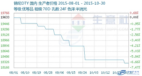 一、锦纶DTY市场价格走势图 二、市场分析 据监测显示,本周(10.26-10.30)国内生产锦纶DTY70D/24F主流价格在17500-18500