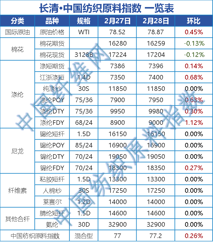 纺织下游不济 原料将趋疲软(中纤网)——一周市场行情(2024.3.1)