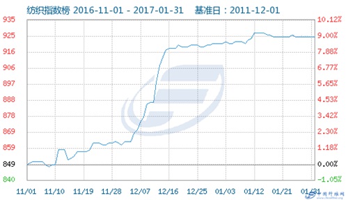 从纺织指数走势来看,2016年12月中旬开始纺织市场停止了大幅上涨的脚步,进入高位窄幅调整状态。整个1月份走势呈先涨后跌态势,截止1月31日纺织指数9