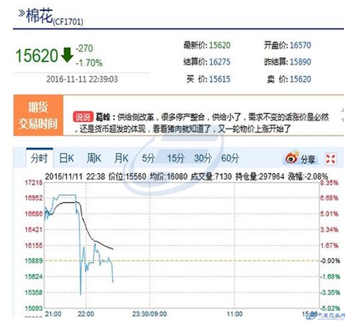 想必最近棉花的行情大家都多多少少略有所闻!在双十一之时,棉花期货一路攀涨,开盘即涨停,不想夜间也“效仿”,直接跌停!上周(11月7日-11月11日),受国内大宗商品期货市场影响,郑州棉花期货价格出现