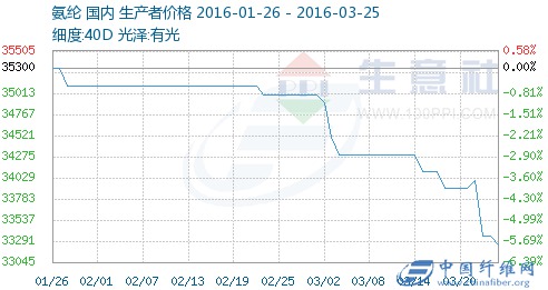 一、氨纶市场价格走势二、市场分析 截止到3月25日,40D氨纶主流报价在29000-35000元/吨左右,较月初降幅5%。周内氨纶市场交投一般,下游织造业开工恢复正常,市场需求增加,但氨纶行业库存