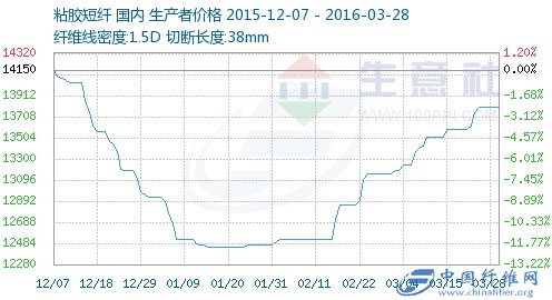 3月28日粘胶短纤商品指数为103.37,与上一日持平,较周期内最高点110.11点(2015-11-18)下降了6.12%,较2015年03月19日最低点86.73点上涨了19.19%。(注:周期指2013-09-01至今)