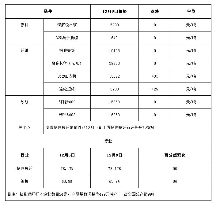 本周日便是12月15日,期间传出来的部分消息比较负面,市场紧张情绪上升,整体或处于谨慎交投状态,业者当前重点关注中下旬高端粘胶短纤价格调整情况,下探信号较为强烈,人棉纱自11月份以来多数型号已明显超跌,纵然按预期粘胶短纤价位核算,纺费都相对有限,因此价格继续深跌预期有限。