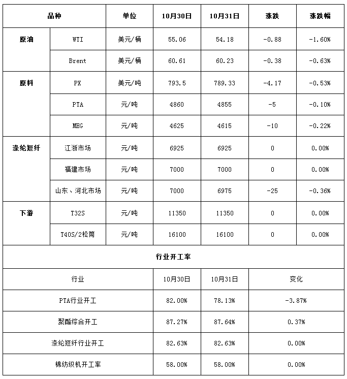 新凤鸣220万吨PTA装置已于10月29日投料50%,另外50%预计12月进行试车;