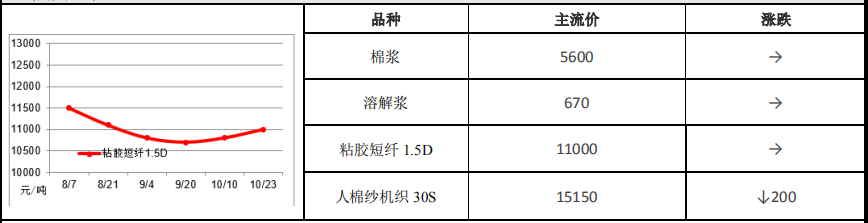 目前中端厂家价格报至 11400 元/吨附近,高端厂家报价在 11500 元/吨附近,实际执行略低 200-300 元/吨。 粘胶长丝行情偏弱,外销订单清淡,内销表现一般,长丝厂家出货难度较大。120D 常规品种一档丝 40500-41000 元/吨,二档在 38000-39000 元/吨,三3600037000 /吨。人棉纱市场整体动静不大,部分产品价格有所回升,浙江萧绍产环锭纺 30S 价格在 15300-15400 /吨。