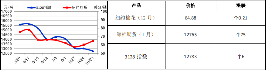 现货板块,市场多出货为主,价格维持,山东一厂家地产 3128 出厂价报 12400 元毛重带票,湖北一厂家双 29 级报 12200 元/吨毛重,当地库自提,随轧随卖,走货不多。浙江一商家疆棉机采双 29 级新疆库报价在 12600 元/吨公定自提,商家库存充足,出货积极。10 月 23 日郑棉仓单 9485(+3)张,其中新疆棉 8732(+4)张,内地 753(-1)张,其中 19/20年度 95(+31)张,18/19 年度 9390(-28)张。有效预报 702(+71)张。仓单+预报 10187(+74)张。今日外棉到港报价小幅下跌。