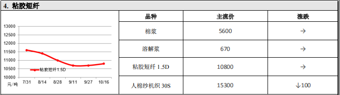 粘胶短纤市场总体维持平静,厂商产销近期反馈较好,价格小幅上涨,不过下游纱线市场较为平静,纱线价格并未有所跟进,海龙装置即将搬迁,后期或将利好行情向上。目前中端粘短价格在 10700-10900 元/吨,高端价格在 11100-11200 元/吨。粘胶长丝行情偏弱,长丝工厂订单不多,淡季期间出货压力较大,行情略显软。120D 常规品种一档丝 40500-41000 元/吨,二档在 38000-39000 元/吨,三档 36000-37000 元/吨。人棉纱市场整体动静不大,部分产品价格有所回升,浙江萧绍产环锭纺 30S 价格在15300-15400 元/吨。