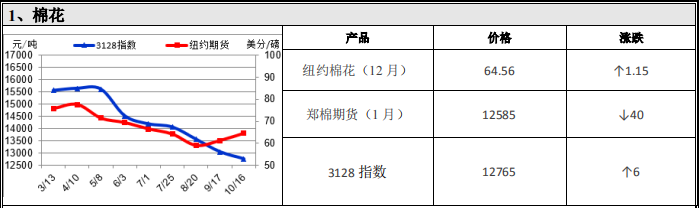 受贸易战缓和减产消息影响,棉农惜售情绪提升,收购价呈现小涨趋势,奎屯地区 3128 级衣分 39 收购均价在 4.9-5 元/公斤左右,约折皮棉 11700-11900 元/吨左右。而由于近期籽棉收购价格陆续上涨,也有部分轧花厂收购出现放缓。而新棉板块市场陆续销售,因籽棉收购价格略升,山东一厂家地产 3128 出厂价报 12400 元毛重带票,有百元上调,随轧随卖,走货不多。10 月 16 日郑棉仓单 9630(-33)张,其中新疆棉 8876(-50)张,内地 754(+17)张,其中 19/20 年度 37(+20)张,18/19 年度 9593(-53)张。有效预报 144(+50)张。仓单+预报 9774(+17)张。今日外棉到港报价大幅上涨。印度棉 Shankar-6 1-5/32 装运期 11/12 月报价 75.85 美分/跌 1 美分,折滑准税下报价 14471 元/吨跌 97 元;1%配额关税下港口自提报价 13221 元/吨跌 172 元。美棉 EMOT SM装运期 11/12 月报价77.75 美分/磅涨 1.35 美分,折滑准税下报价 14670 元/吨涨 147 元;1%配额关税下港口自提报 13547 吨涨 232元。澳大利亚 SM 装运期 10/11 月报价 86.75 美分/磅涨 1 美分,折滑准税下报价 15681 元/吨涨 120 元;1%配额关税下港口自提价15092 元/吨涨 172 元。