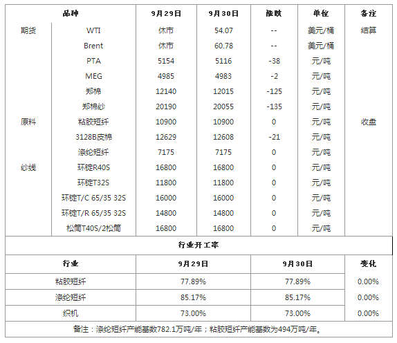 涤棉纱:国庆期间,纺织行业按部就班操作,部分纺企产销增压,不断让利于下游,然缺乏实际需求支撑,加之经贸磋商存有诸多变数,预计纱线市场窄幅整理,关注消息面变化及双料变化。