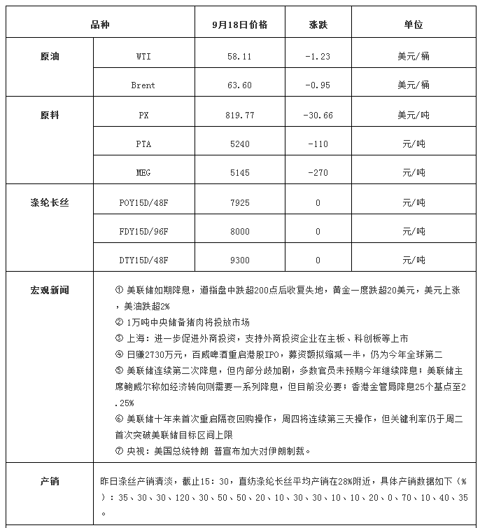 隔夜国际油价继续下跌,PTA、乙二醇期现货亦明显下滑,聚酯成本面暂无明显利好。而下游前期补仓后现阶段需求回落,场内交投气氛归于平淡,昨日工厂产销数据整体偏弱,然前期放量后,目前工厂库存水平偏低,因此预计今日涤纶长丝将延续震荡整理的走势。