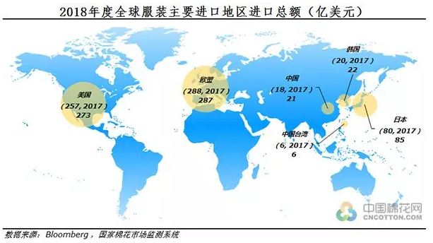 如果我们来看2018年9月至2019年3月,以六个主要服装进口地区2018年度进口量总和为基数,美国和欧盟28国的服装进口总金额分别占贸易总规模的39.7%和 41.7%,而欧盟、日本、韩国和中国台湾的服装进口总量,占贸易总额的58.2%,由此可见全球服装消费市场呈现出较强的聚集效应。