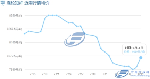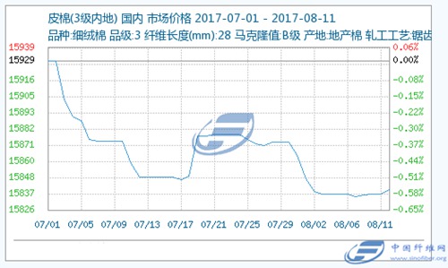本周国内棉花现货市场行情呈小幅回暖态势,截止8月11日3128B皮棉市场均价在15840元/吨,较周初15835元/吨,上涨0.03%,同比上涨7.16%。期货方面郑棉期货同样有所回暖,8月7日郑棉收盘价为15015元/吨,8月11日郑棉收盘价为15190元/吨,上涨175元/吨,涨幅1.16%。