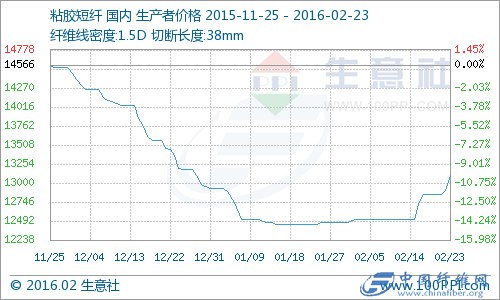 【中国纤维网讯】一.粘胶短纤价格走势  2月22日粘胶短纤商品指数为96.63,较上一日上升了0.38点,较周期内最高点110.11点(2015-11-18)下降了12.24%,较2015年03月1