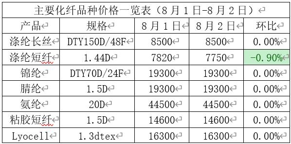 中国纤维网消息:8月1-2日,涤纶短纤下跌0.9% ,其余品种保持不变。