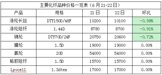 根据中国纤维网市场拓展部6月22日消息,6月22-22日,涤纶长丝价格下跌0.98%,涤纶短纤下跌0.91%,锦纶下跌0.72% ,其余品种保持不变。