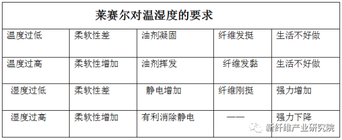 莱赛尔生产过程中,温湿度的控制对莱赛尔质量有很大的影响,莱赛尔在生产过程中如果温湿度不稳定,就会造成莱赛尔纤维的质量不稳定。温度过低,纤维柔性差,油剂凝固,纤维发挺,在纺纱过程中生活不好做;温度过高,柔软性增加,油剂挥发,纤维容易发粘,容易出现丝束,在纺纱过程中生活不好做;湿度过低,柔软性差,静电增加,纤维刚挺,强力增加;湿度过高,柔软性增强,有利于消除静电,但是强度下降。
