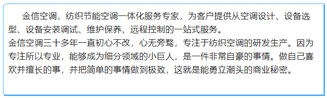 纺织空调除尘节能一般分三个方面:设计节能、选型节能、使用节能。其中设计节能15—20%,选型节能10—15%,使用节能20—25%。