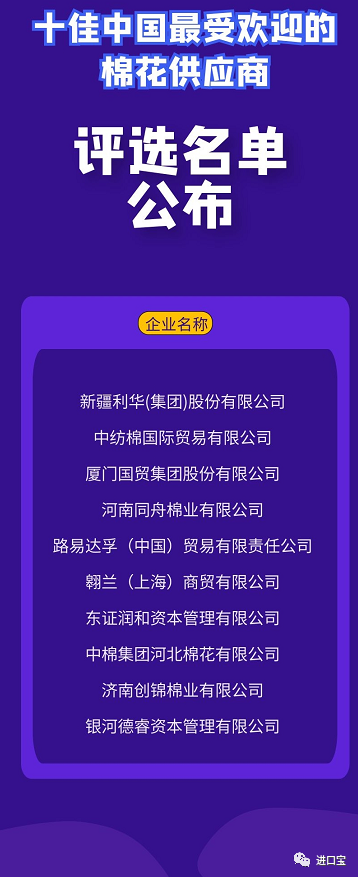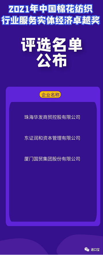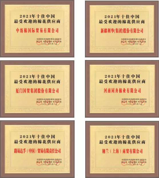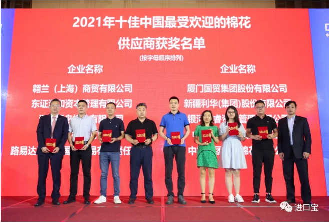 经过持续十多天的投票评比,2021年十佳最受欢迎的棉花供应商、棉花纺织行业服务实体经济卓越奖也在此论坛中展现。评选标准由网络投票数+进口宝平台交易量+进口宝合同履约率+客户投诉率+客户满意度五部分组成。经专家组综合打分评选。