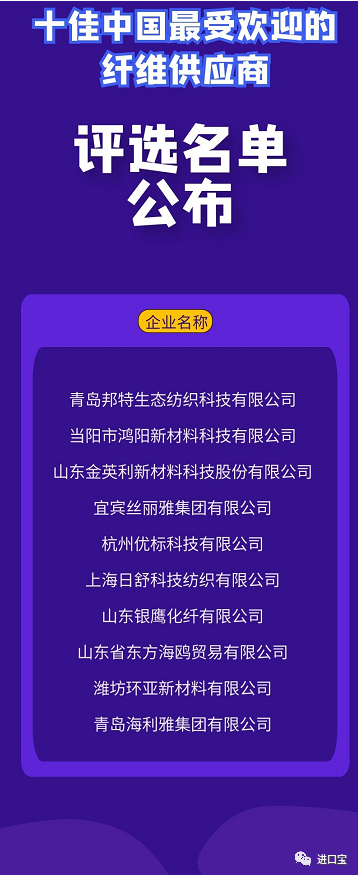 经过持续十多天的投票评比,2021年十佳最受欢迎的纤维供应商也在此论坛中展现。评选标准由网络投票数+进口宝平台交易量+进口宝合同履约率+客户投诉率+客户满意度五部分组成。经专家组综合打分评选。