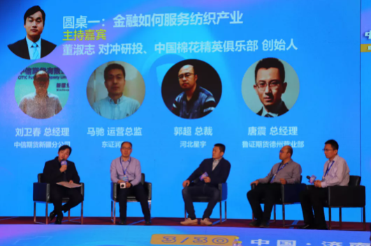 中国棉花精英俱乐部主席、对冲研投创始人董淑志、中信期货有限公司新疆分公司总经理刘卫春、东证润和资产运营部总监马驰、河北星宇纺织原料有限公司总裁郭超、鲁证期货股份有限公司德州营业部唐震,就金融如何服务纺织产业就行现场说法。