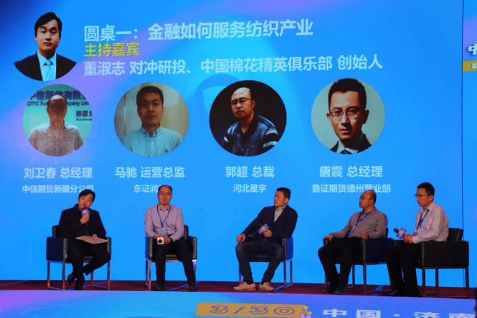 中国棉花精英俱乐部主席、对冲研投创始人董淑志、中信期货有限公司新疆分公司总经理刘卫春、东证润和资产运营部总监马驰、河北星宇纺织原料有限公司总裁郭超、鲁证期货股份有限公司德州营业部唐震,就金融如何服务纺织产业就行现场说法。