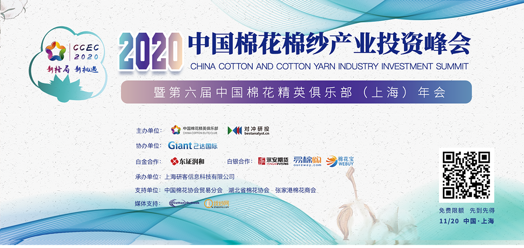 “2020中国棉花棉纱产业投资峰会暨第六届中国棉花精英俱乐部(上海)年会”将于11月20日在上海召开举办。