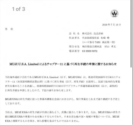7月10日,日本零售巨头无印良品(Muji)的母公司良品计划宣布,其美国子公司已申请破产,负债6400万美元,原因是受到新冠肺炎疫情影响,自3月17日起美国所有门店被迫暂停运营,美国业务持续亏损。