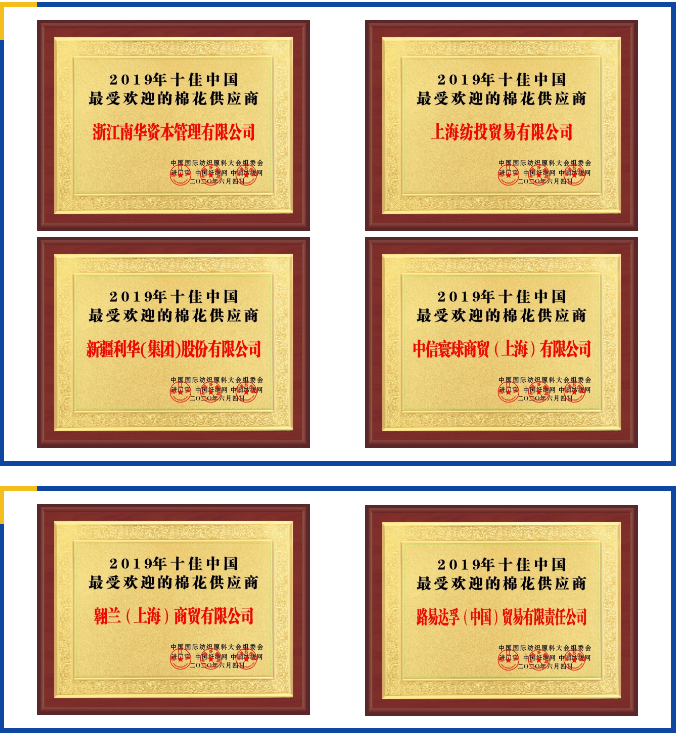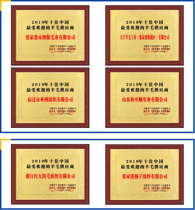 经过持续十多天的投票评比,2019年十佳最受欢迎的羊毛/棉花/新型纤维供应商授牌仪式也在此次高端论坛中举行。评选标准由网络投票数+进口宝平台交易量+进口宝合同履约率+客户投诉率+客户满意度五部分组成。经专家组综合打分评选。